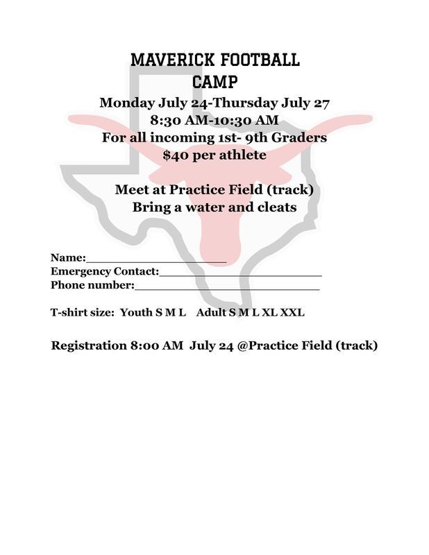 It's time for Maverick football camp! Come join us on Monday, July 24th through Thursday, July 27th from 8:30 AM-10:30 AM. All incoming 1st-9th graders are welcome. It is $40 per athlete. *Registration will be at 8:00 AM-July 24th at the practice field (track).