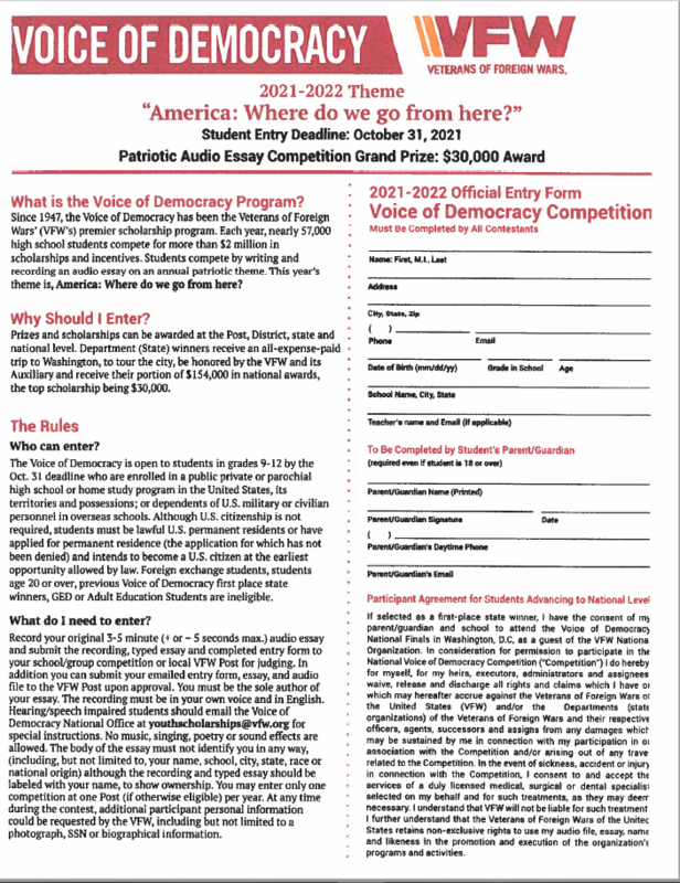 The national first place winner receives a $30,000 scholarship paid directly to the recipient’s American university, college or vocational/technical school. A complete list of other national scholarships range from $1,000-$16,000, and the first place winner from each VFW Department (state) wins a minimum scholarship of $1,000. Want to apply? Read the rules and eligibility requirements, and download and complete the 2021-2022 Voice of Democracy entry form as all student entries must be submitted to a sponsoring local VFW Post by midnight, Oct. 31.
