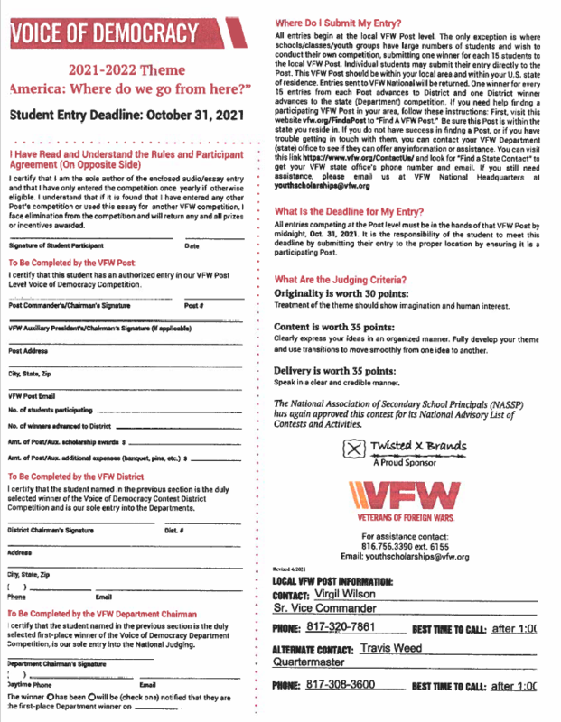 Please be aware of this amazing opportunity for our students. The VFW is now taking applications for the "Voice of Democracy" Essay Scholarship. This is an opportunity to win $1,000 to $30,000 in scholarship money.I have attached the "rules" and application to this email.